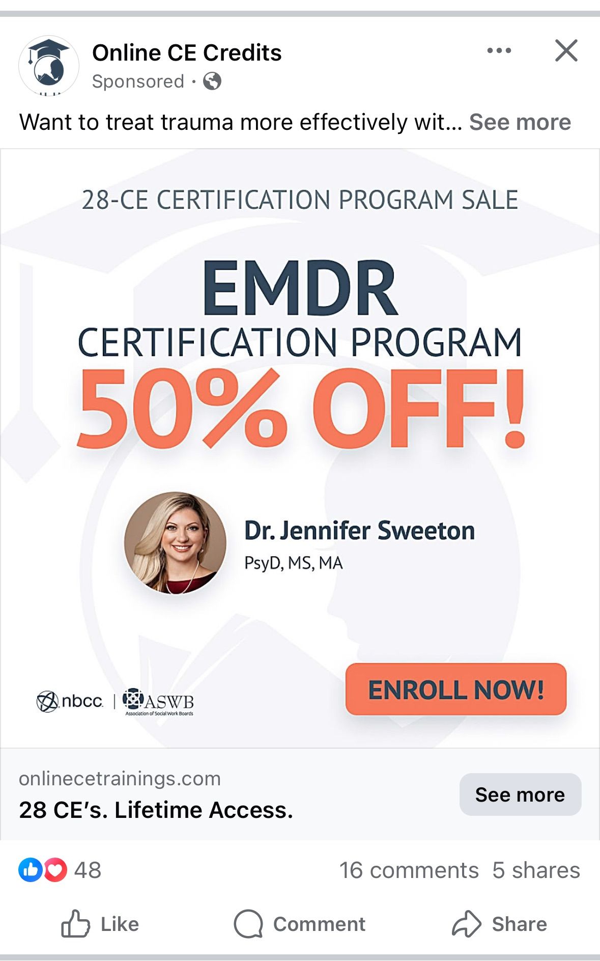 Here is an example of a Facebook marketing ad that came up on my feed of a non-EMDRIA-approved training program that makes high promises but little chance of delivering: